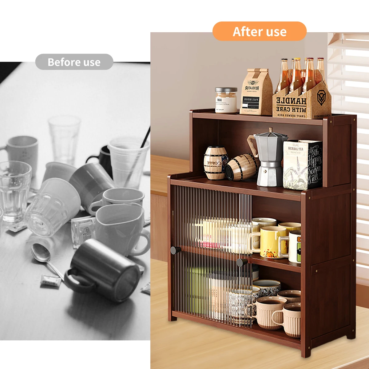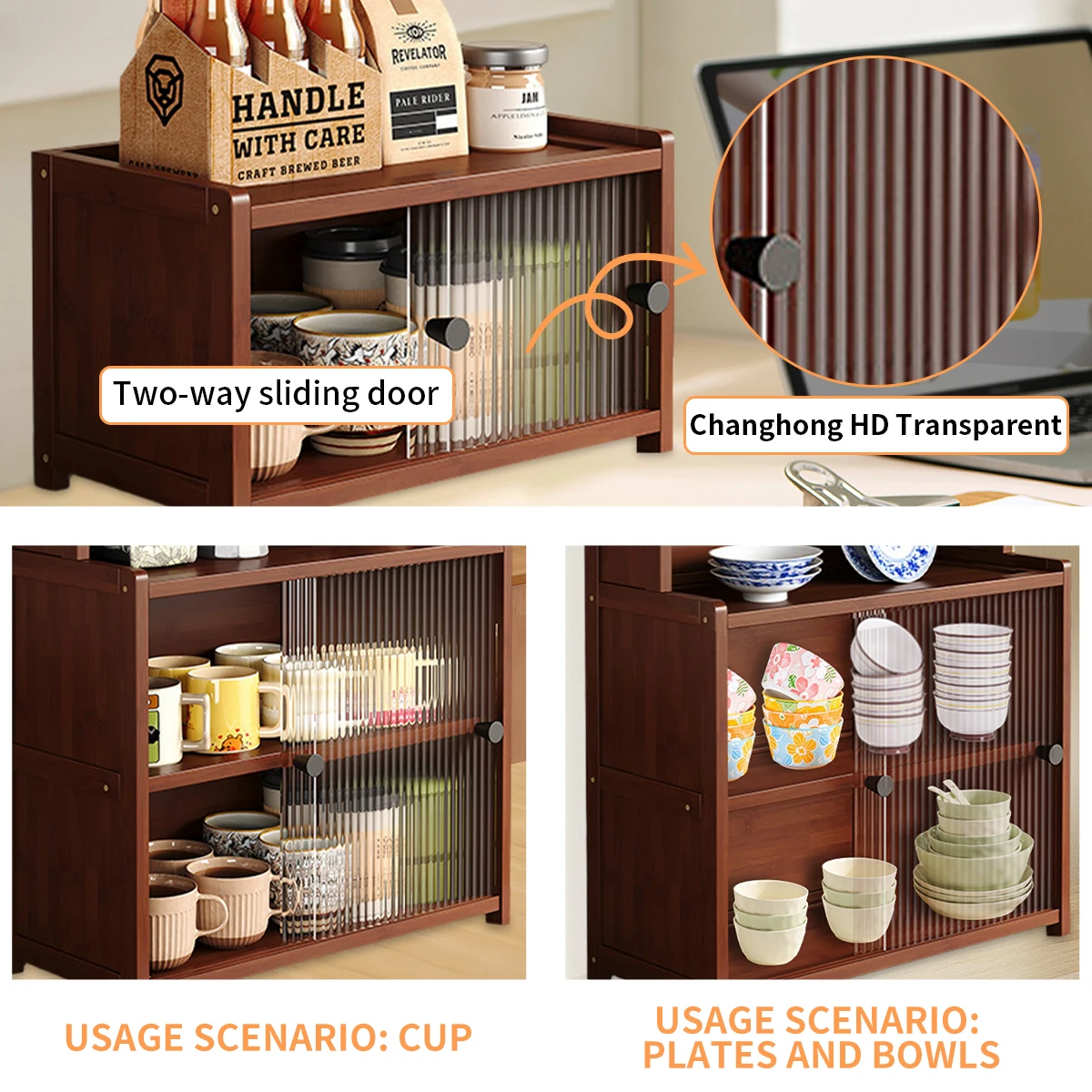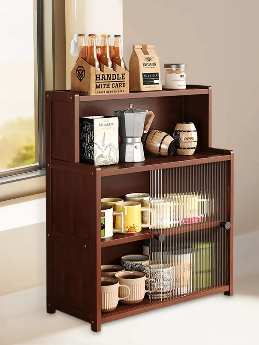Bamboo Kitchen Sideboard | 1/2/3-Tier Cabinet - Rustic Acrylic Doors + Spice/Tableware Storage (Walnut)